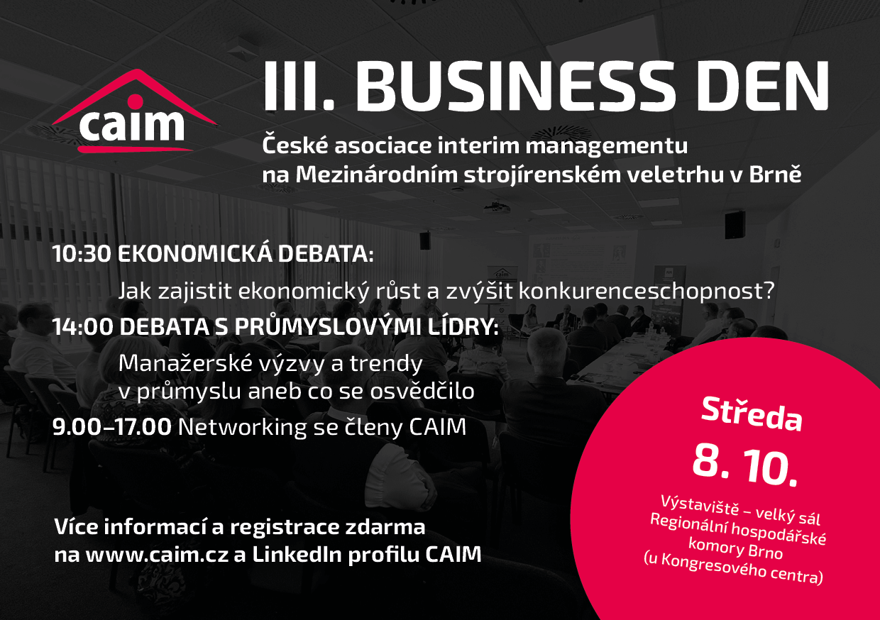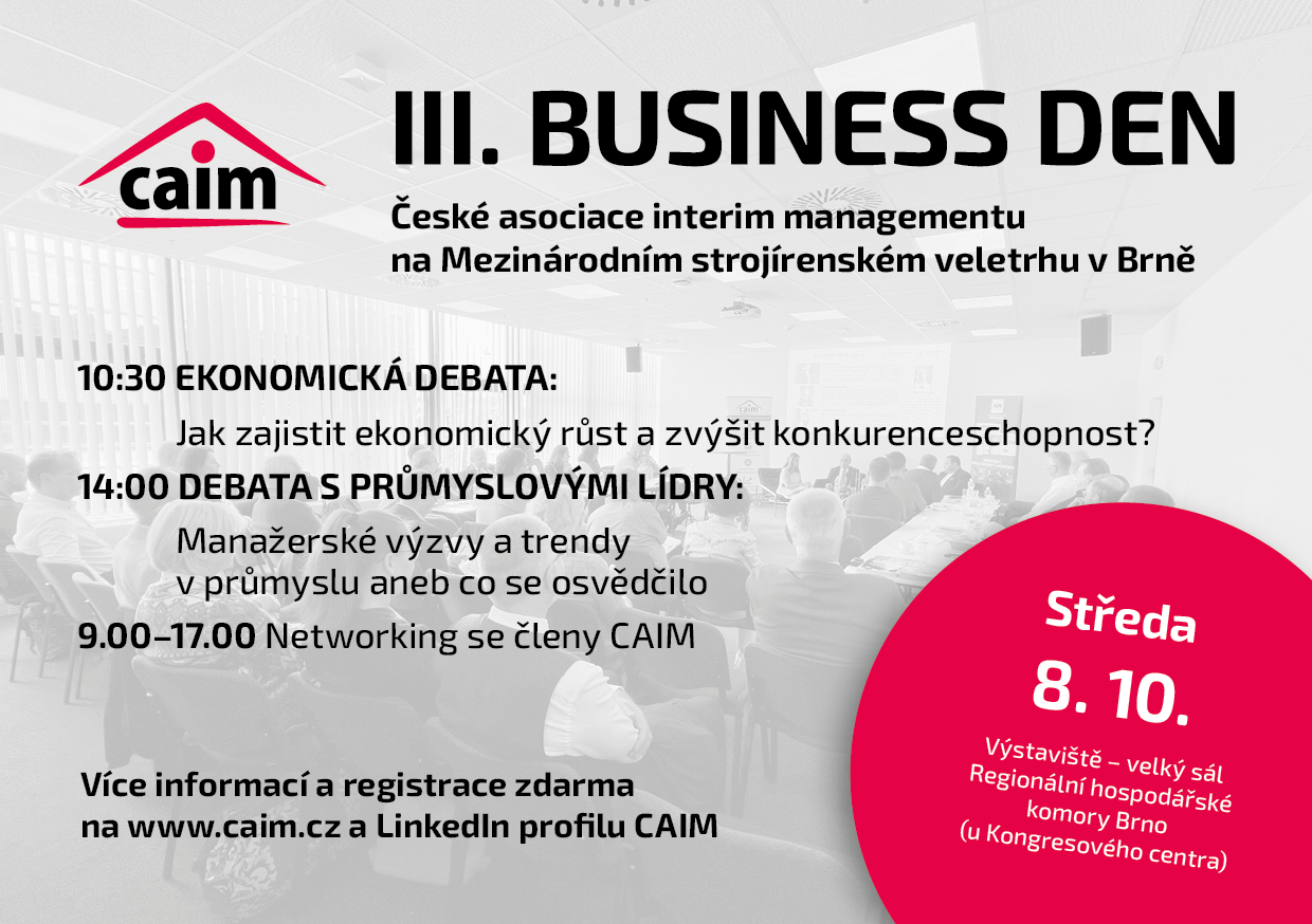 Zveme Vás na III. BUSINESS DEN České asociace interim managementu. Uskuteční se ve středu 8. října 2025 na Mezinárodním strojírenském veletrhu v Brně.